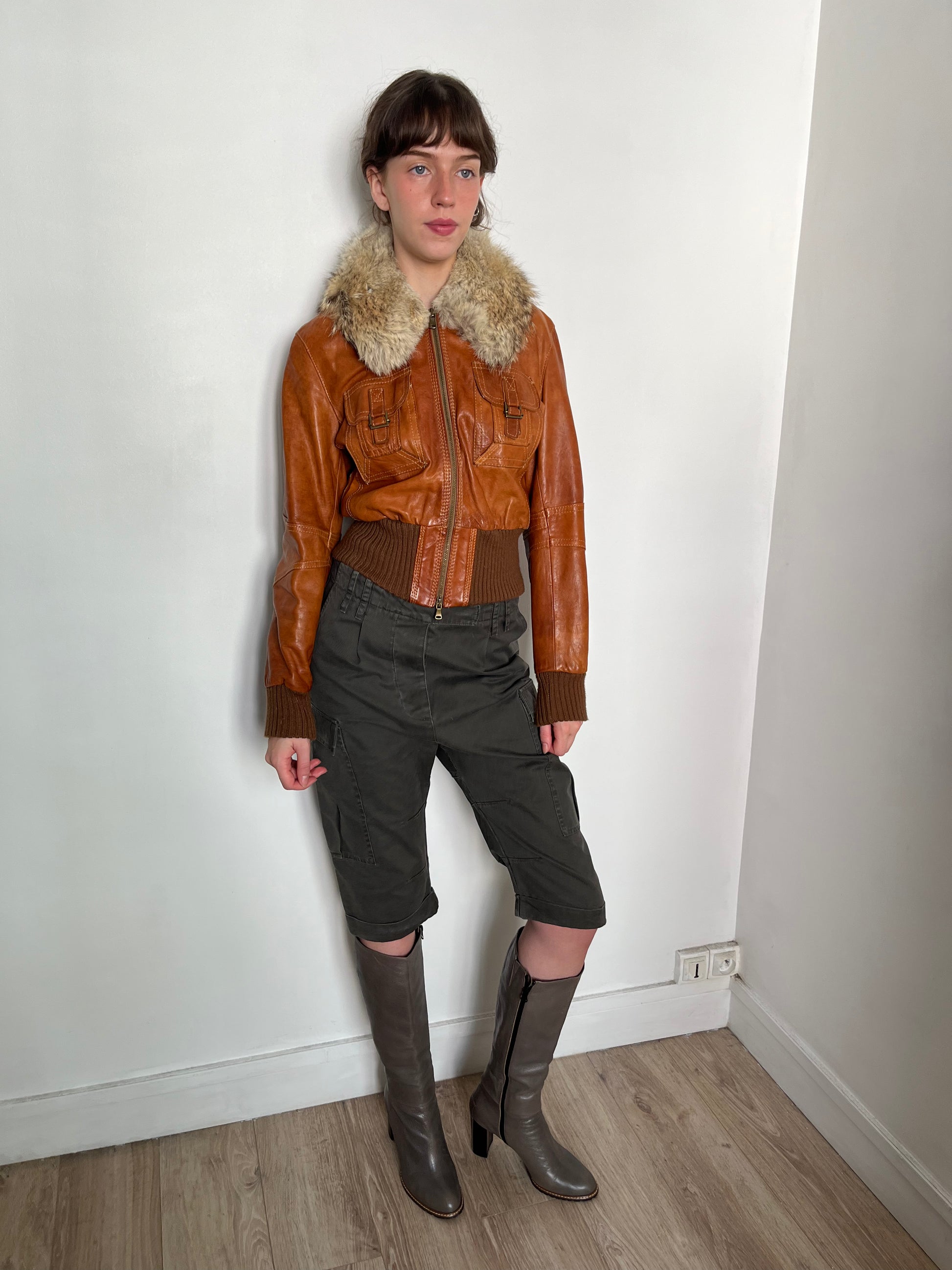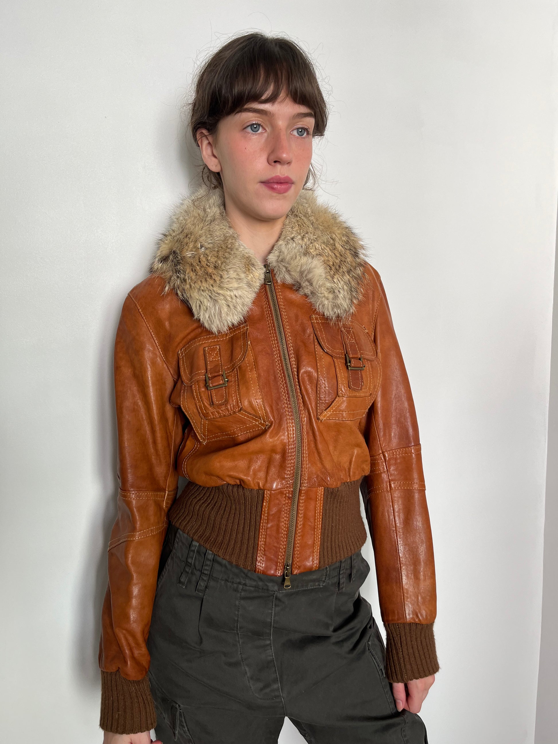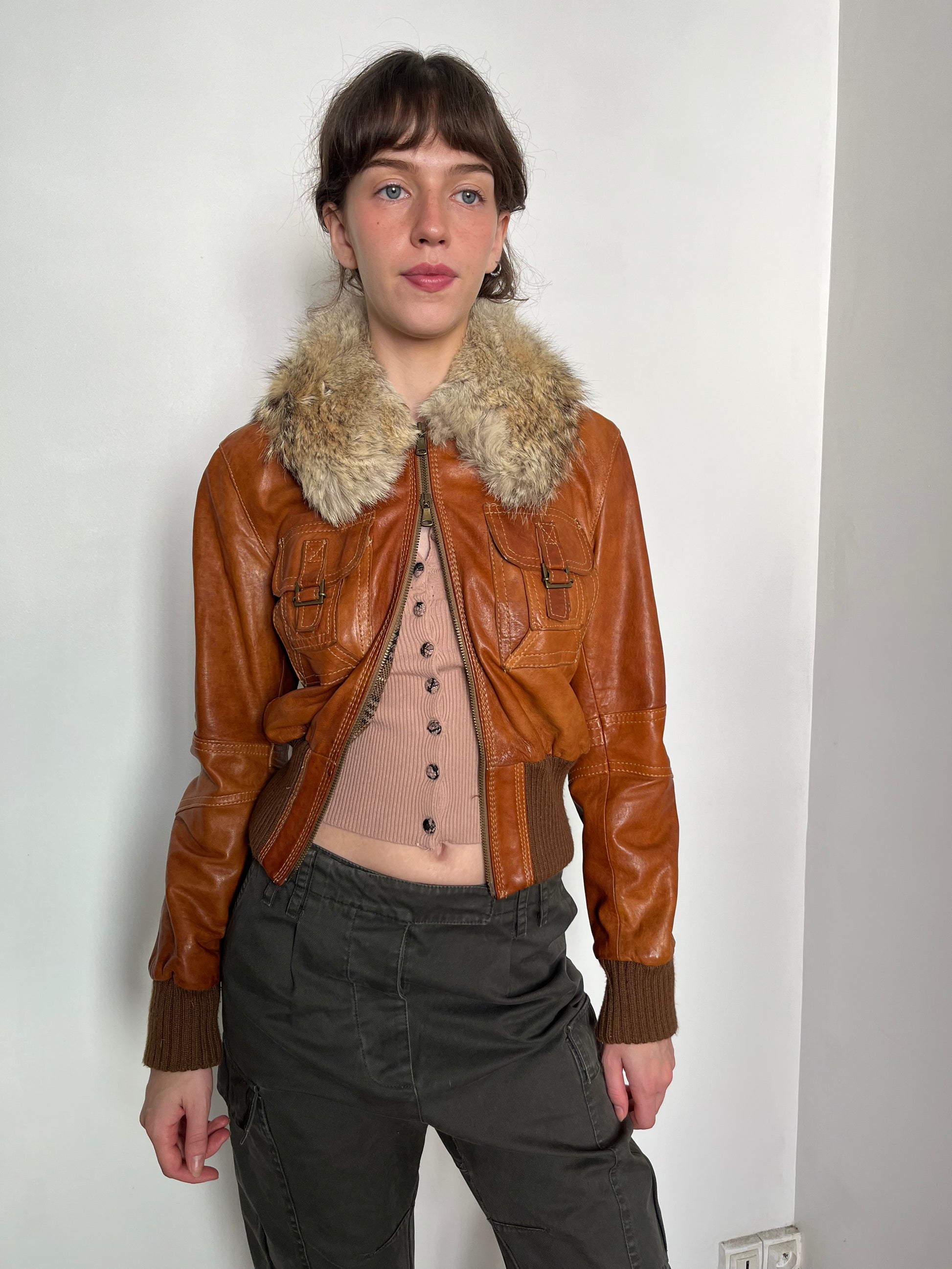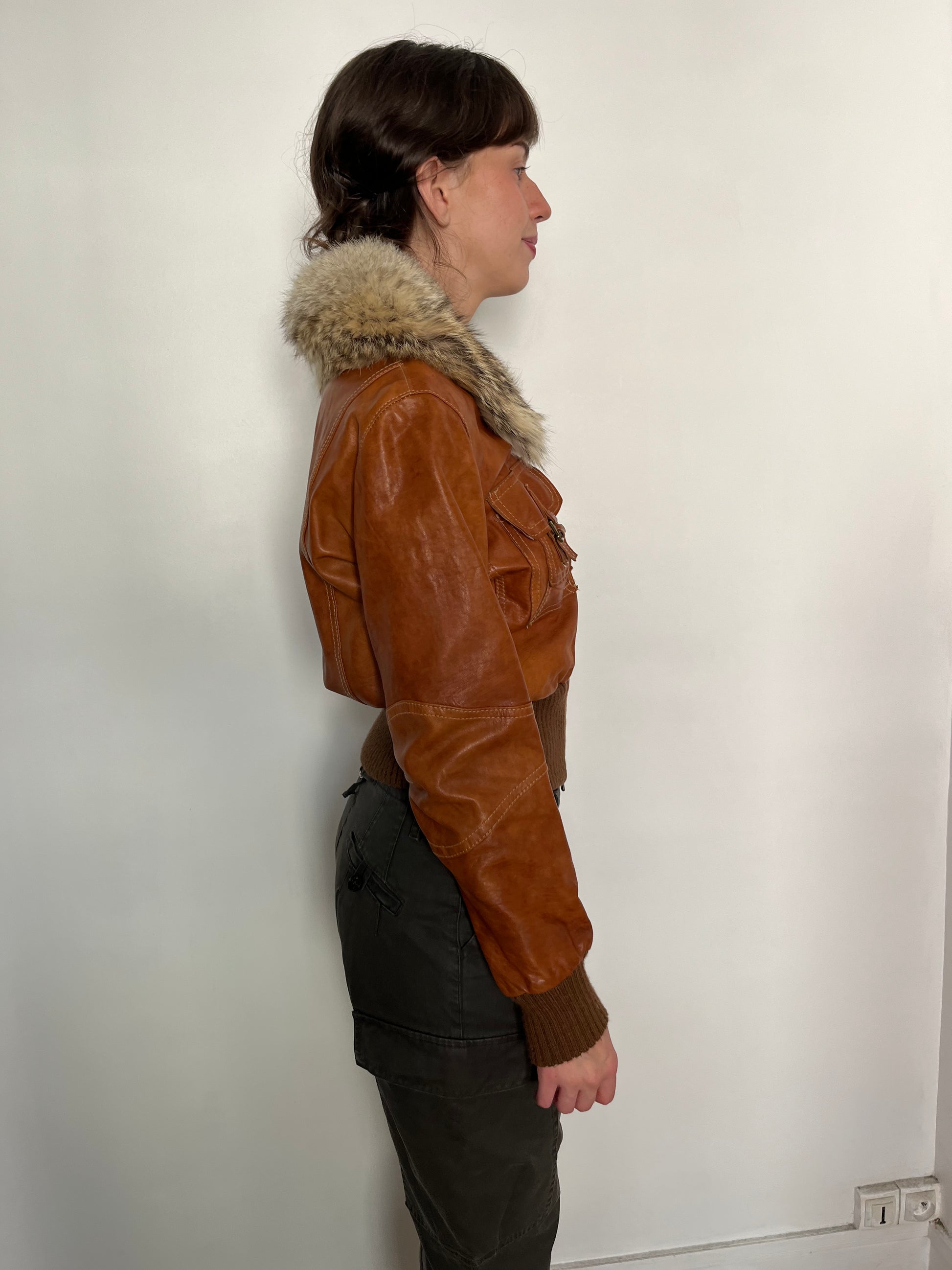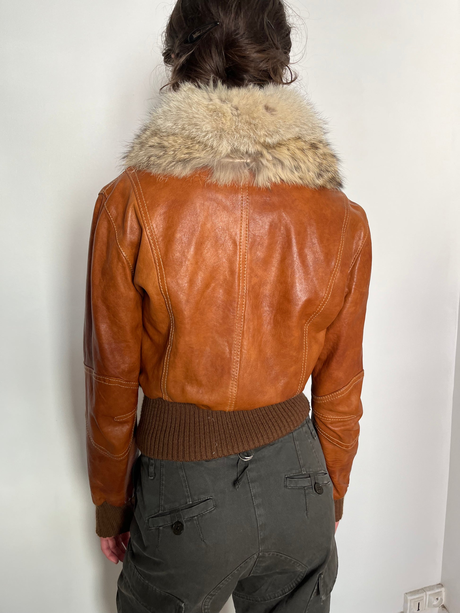 brown leather jacket with fur hood